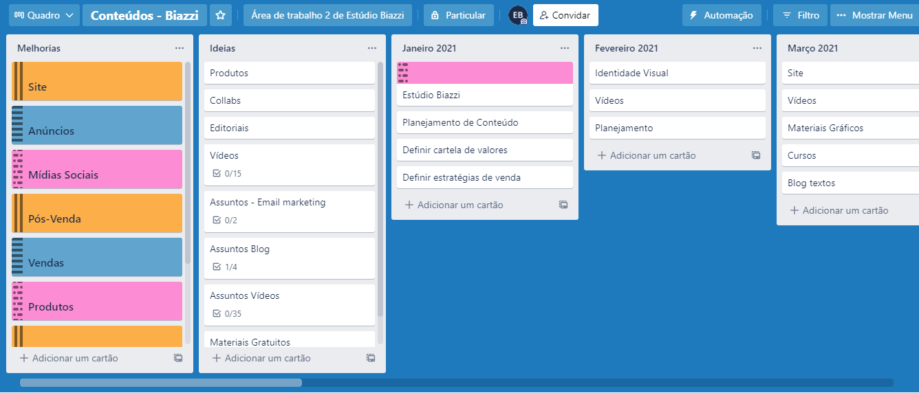 2. Organizar as metas em pequenas demandas – Após definir seus objetivos, partilhe todas as etapas que necessitam ser realizadas para chegar em sua conclusão. Uma dica bem legal para organizar suas metas e etapas é utilizar ferramentas que facilitem o processo. Eu utilizo o Trello ele é de fácil usabilidade, deixa tudo bem organizado e ainda tem aplicativo para celular o que facilita a visualização em qualquer local. Portanto podemos dividir os objetivos em pequenos blocos de itens que precisamos executar para conquistar o que se deseja. Eu gosto de organizar o Trello desta forma, defino as demandas e vou dividindo o que eu preciso executar por mês.